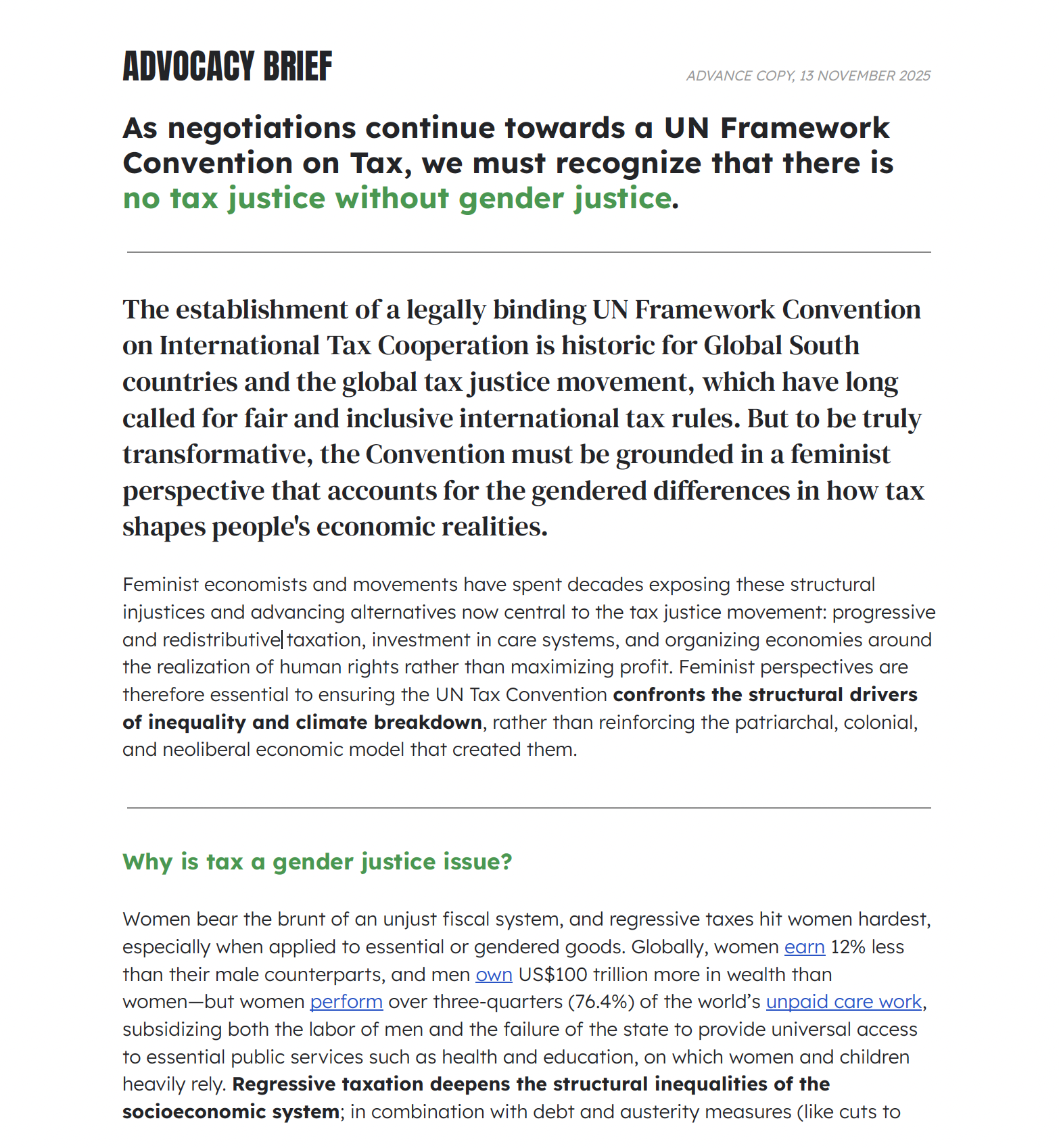 The establishment of a legally binding UN Framework Convention on International Tax Cooperation is historic for Global South countries and the global tax justice movement, which have long called for fair and inclusive international tax rules. But to be truly transformative, the Convention must be grounded in a feminist perspective that accounts for the gendered differences in how tax shapes people’s economic realities. Feminist economists and movements have spent decades exposing these structural injustices and advancing alternatives now central to the tax justice movement: progressive and redistributive taxation, investment in care systems, and organizing economies around the realization of human rights rather than maximizing profit.