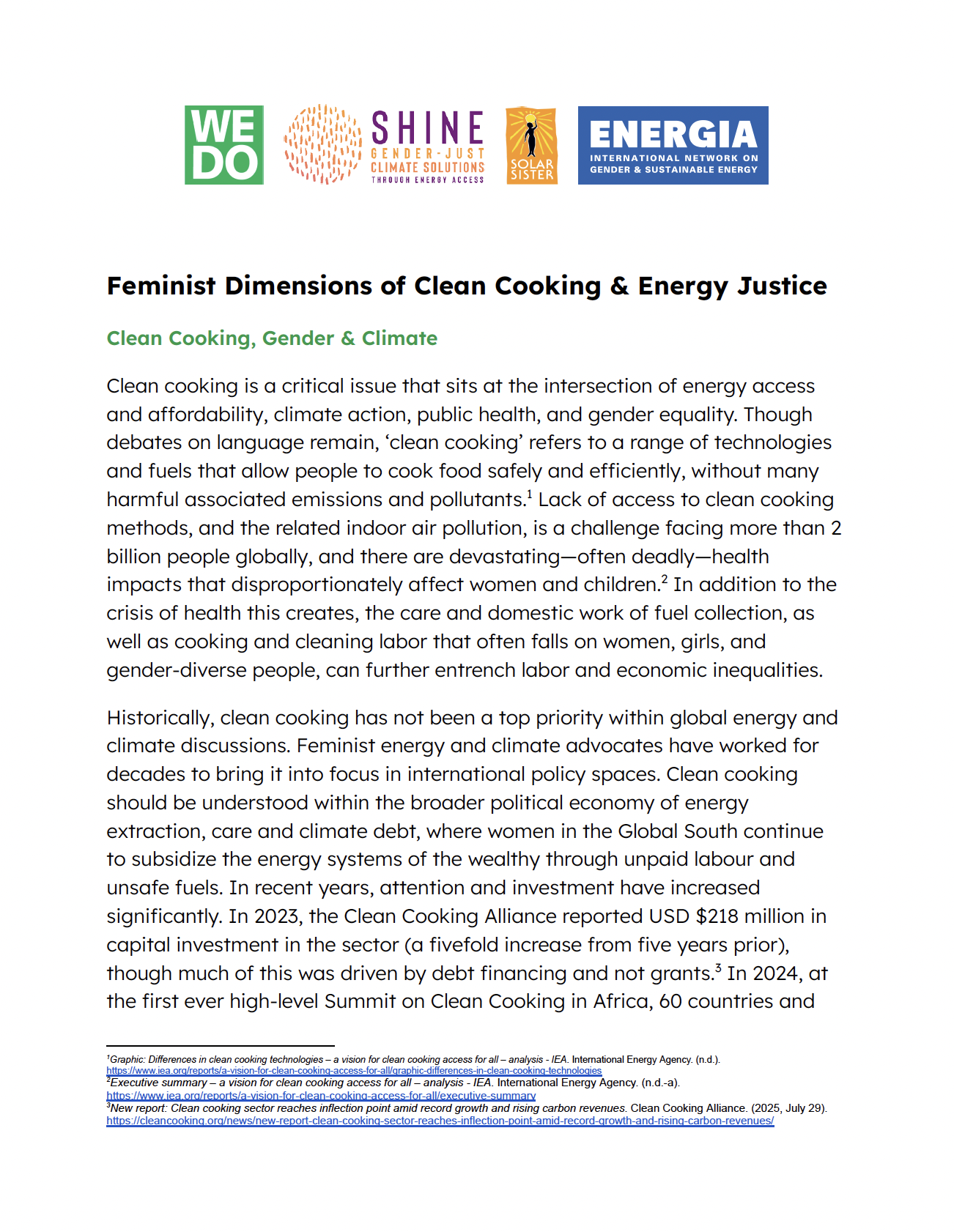 Historically, clean cooking has not been a top priority within global energy and climate discussions. Feminist energy and climate advocates have worked for decades to bring it into focus in international policy spaces. Clean cooking should be understood within the broader political economy of energy extraction, care and climate debt, where women in the Global South continue to subsidize the energy systems of the wealthy through unpaid labour and unsafe fuels.