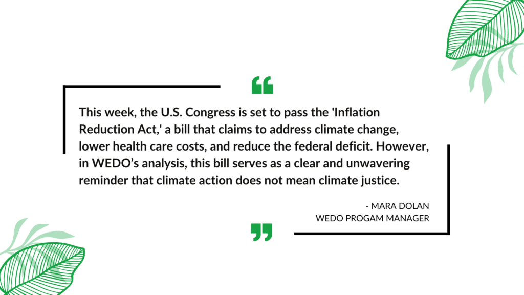 However, in WEDO’s analysis, this bill serves as a clear and unwavering reminder that climate action does not mean climate justice. True solidarity to frontline communities at the forefront of fights against extractive and polluting industries—as well as an understanding of the urgent and existential crisis we face, as outlined in the latest IPCC reports—demands a rejection of the false pretense of historic policy and action baked into corrupt compromise.”