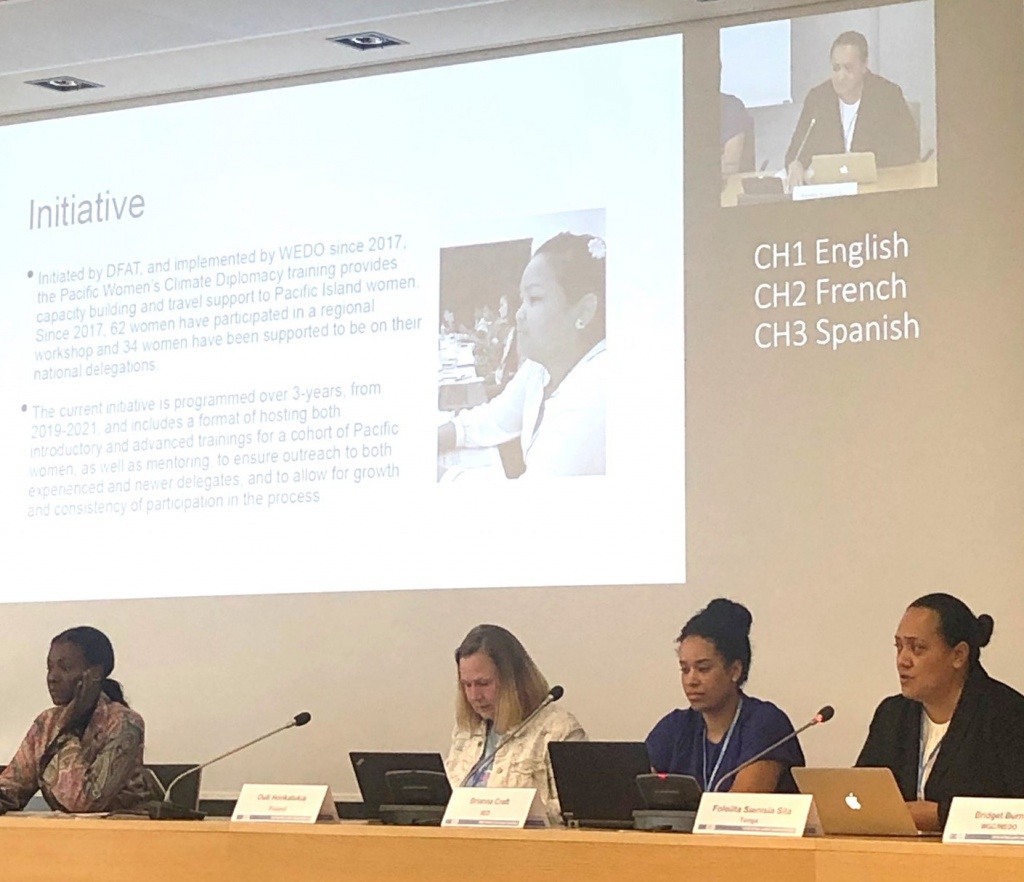 Alongside Fololita on the panel was WEDO Director Bridget Burns who presented on the latest WDF trainings, highlighting the May 2019 Pacific Climate Negotiator Training in Nadi, Fiji and the Negotiations Skills and Technical Language Training, aka Night School, that WEDO facilitated in Bonn earlier this week. She also shared insights on other strategic capacity-building and knowledge sharing initiatives that have proven to be a success, including fundamental contributions of women-led climate solutions as a result of the Gender Just Climate Solutions Awards.