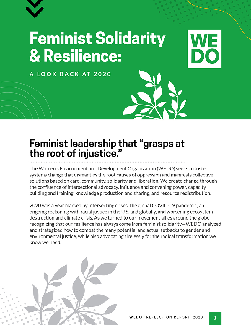 As we continue to find great power in coalitions, WEDO is also strengthening the core infrastructure that underpins our work in collective. In 2021, we hired four staff members to continue building out our programmatic, administrative and communications functions. We also welcomed two new board members, Barbara Y. Phillips and Anabella Rosemberg. And we’re honored to be entering into a new four-year partnership with the Swedish International Development Cooperation Agency (Sida)—which will advance our collective movement for feminist climate and environmental justice through critical and creative support towards WEDO’s goals and the work of our partners.